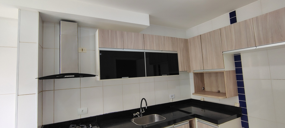 A cozinha é planejada, equipada com armários, gabinete, bancada em granito, cooktop de quatro bocas com forno a gás e coifa de inox. A área de serviço é integrada e também conta com armário embutido, garantindo funcionalidade no dia a dia. O piso interno é em porcelanato, enquanto o garden descoberto possui piso cerâmico, luminária e acesso direto pela sala por meio de porta de blindex, criando um espaço perfeito para momentos ao ar livre.