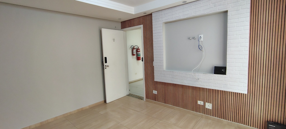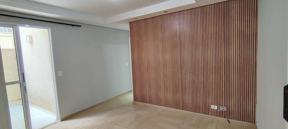 O apartamento conta com dois dormitórios, ambos com armários embutidos, sendo um deles com porta espelhada, além de banheiro social com box de blindex e gabinete. A sala é um dos grandes destaques, com sanca de gesso fechada, sete lâmpadas de LED embutidas, suporte para cortina, painel decorativo em gesso para TV e duas paredes com papel de parede que imita madeira, trazendo um toque moderno e aconchegante ao ambiente. O corredor interno possui teto rebaixado e luminária, reforçando o cuidado nos detalhes.